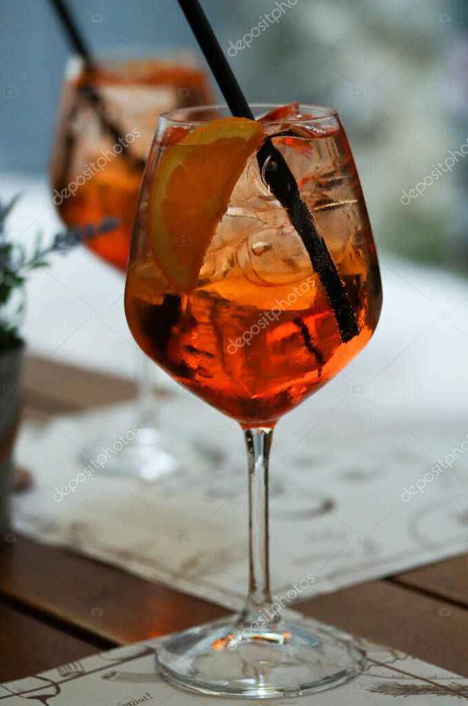 - Two glasses of aperol spritz or campari orange cocktail with orange slice and ice on a restaurant table. Holiday concept. Live photo of having a glass of summer cocktail in vacation