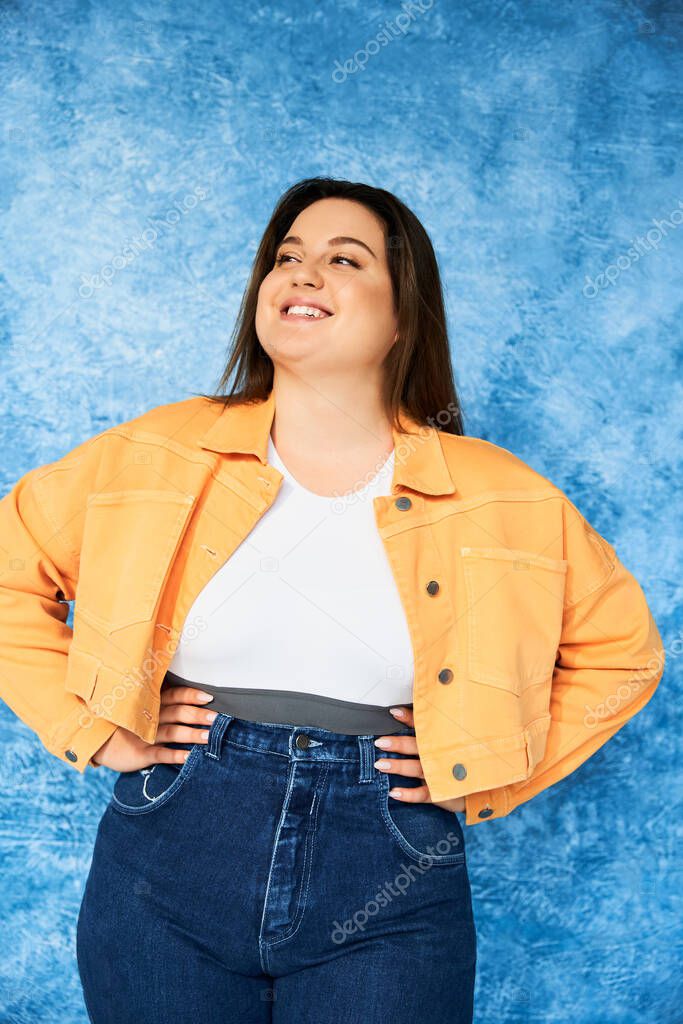 Cheerful plus size woman with long hair and natural makeup wearing crop top, orange jacket and denim jeans while posing with hands on hips and looking away on mottled blue background, body positive