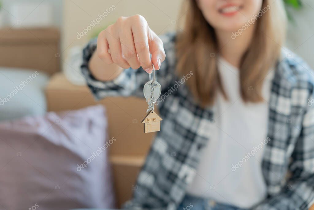 - Moving house, relocation. Woman hold key house keychain in new house. move in new home. Buy or rent real estate. flat tenancy, leasehold property, new landlord, dwelling, loan, mortgage.