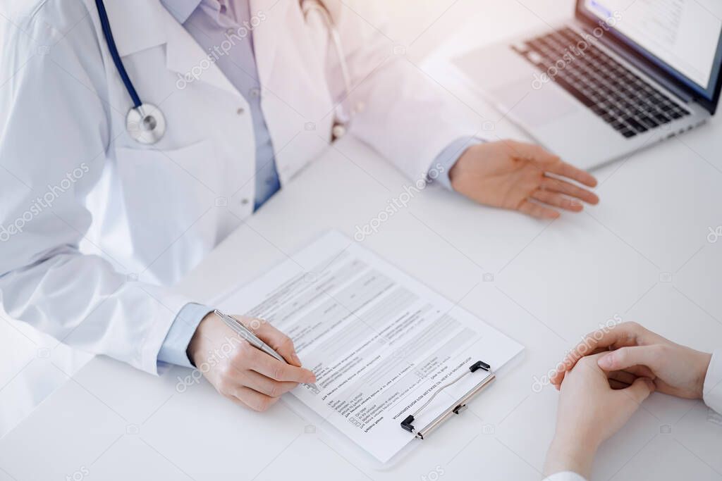 - Doctor and patient discussing current health questions while sitting opposite of each other and using clipboard at the table in clinic, just hands closeup. Medicine concept.