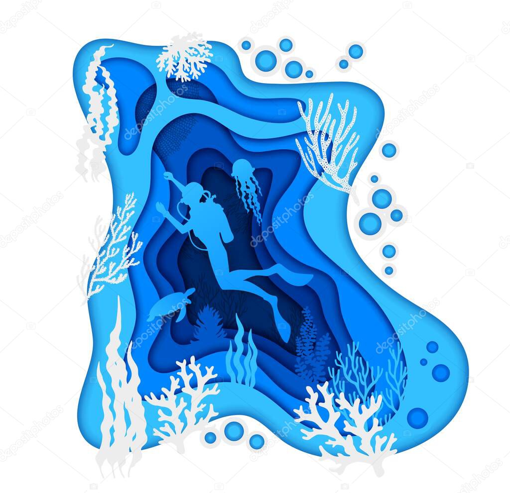 - Diver in underwater paper cut of sea landscape, turtle and seaweeds silhouette, vector ocean bottom. Undersea diving in papercut, scuba diver with aqualung in underwater deep with turtle and jellyfish