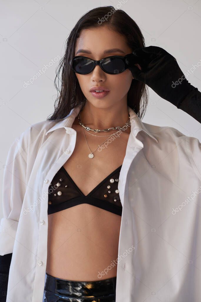 BEAUTIFUL STUDIO BEAUTY MODEL YOUTH STYLE FASHION GLOVES CONCEPT WOMAN ASIAN SUNGLASSES SEXY PERFECT ATTRACTIVE CONCEPTUAL UNDERWEAR TREND BRA ONE PERSON YOUNG ADULT WHITE SHIRT GREY BACKGROUND MODERN WOMAN BEAUTY AND FASHION PERFECT SKIN FASHION TREND FASHION STATEMENT FASHION FORWARD WOMEN FASHION MODERN FASHION COOL STYLE FASHION AND STYLE STYLISH LOOK PERSONAL STYLE FASHION CHOICES BOLD STYLE EDGY STYLE STYLISH OUTFIT EDGY FASHION YOUTHFUL FASHION BRA LOOK