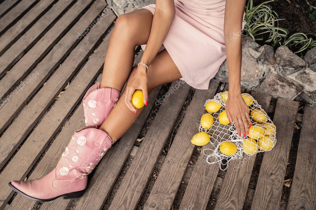 Top view of trendy young african american woman in summer dress and boots holding fresh lemon near mesh bag and sitting in garden center, chic woman in tropical garden, summer concept