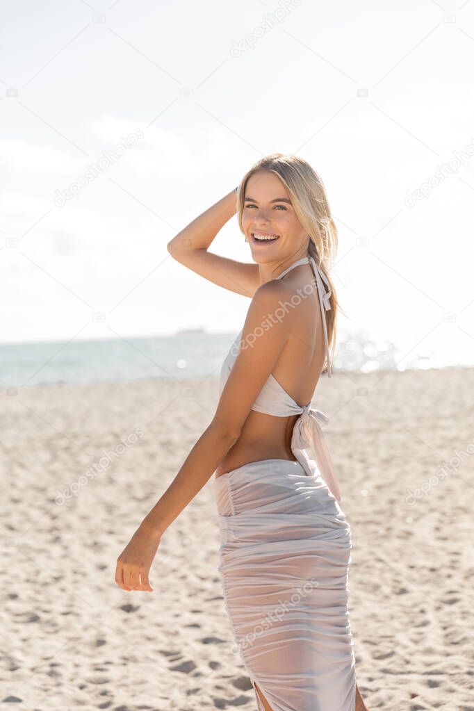 - A young, blonde woman stands gracefully on a sandy Miami beach, taking in the beauty of the horizon and the vast ocean.