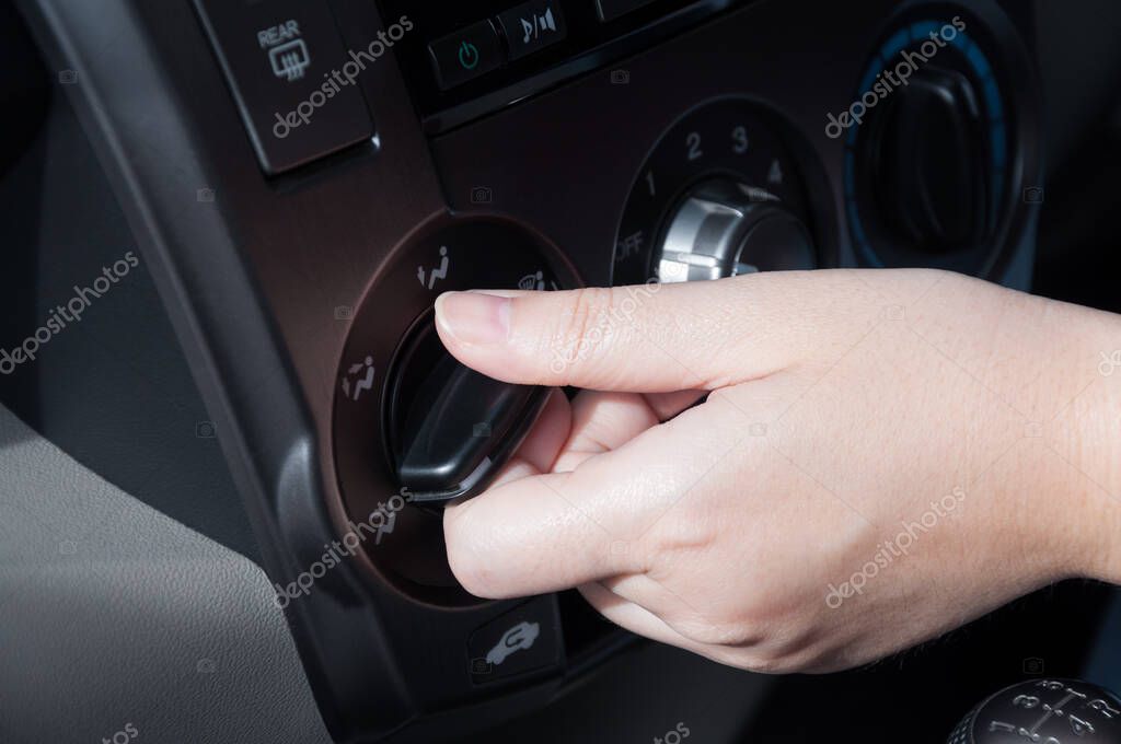 - Woman hand turning on car air conditioning system