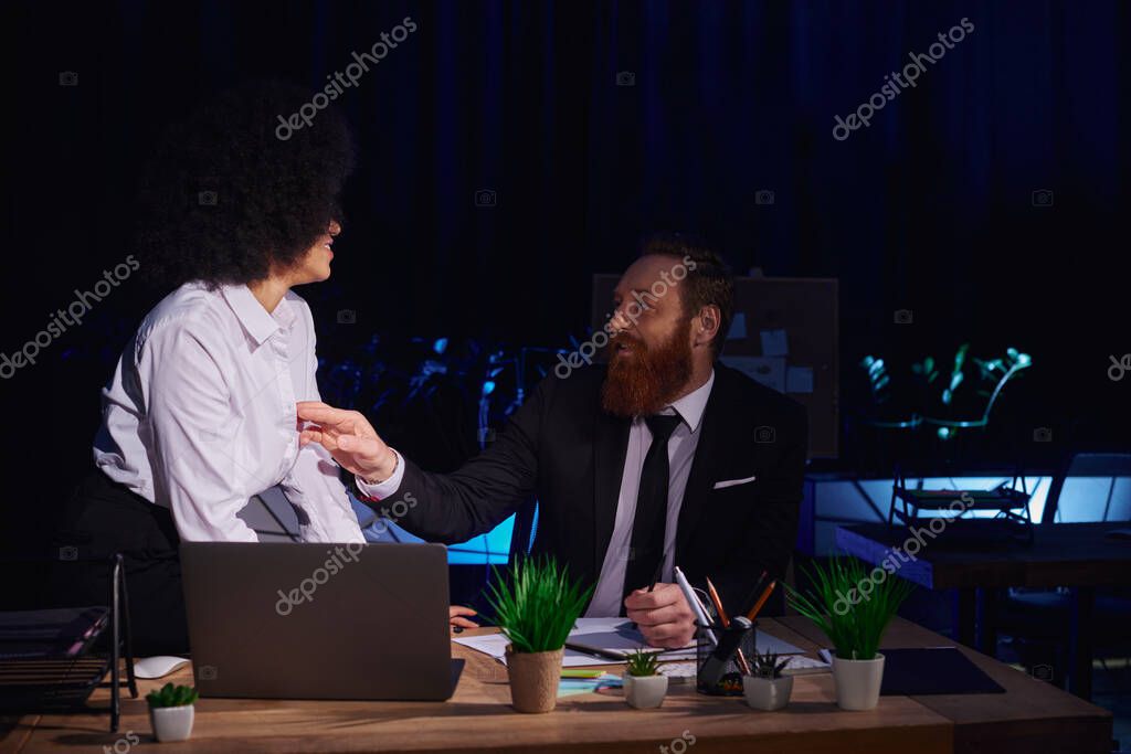Bearded businessman touching blouse of seductive african american woman near laptop in night office