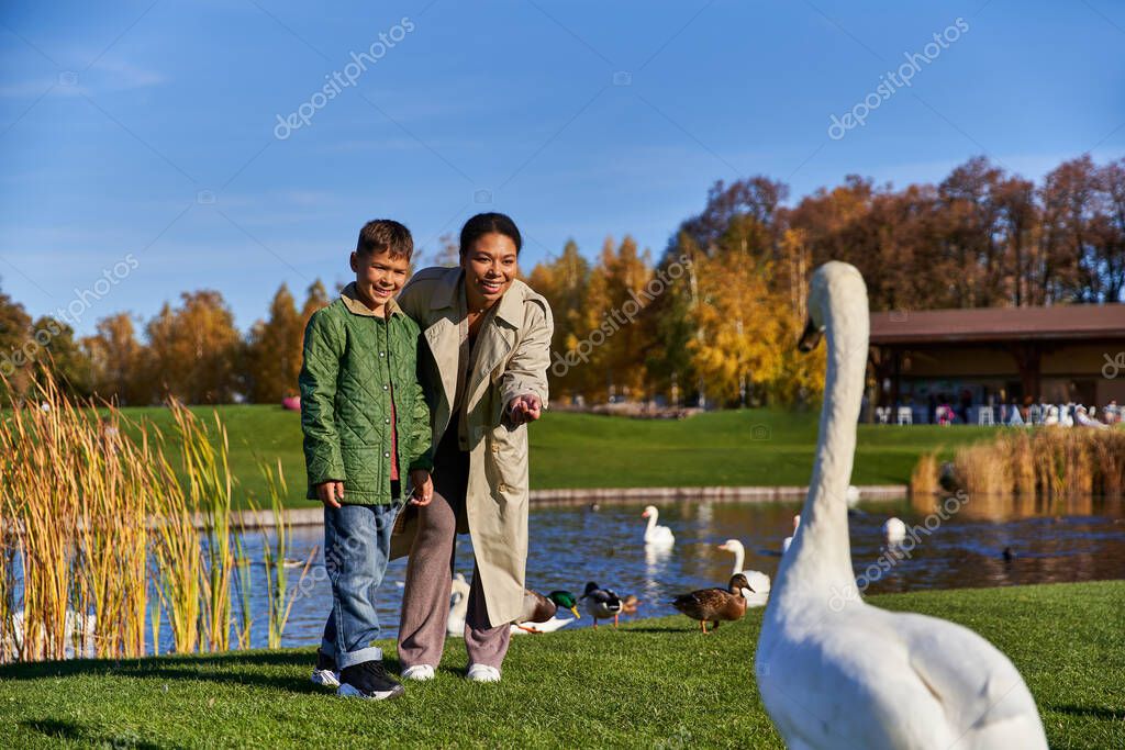 - cheerful african american woman hugging son and looking at white swan in park, autumn fashion, pond
