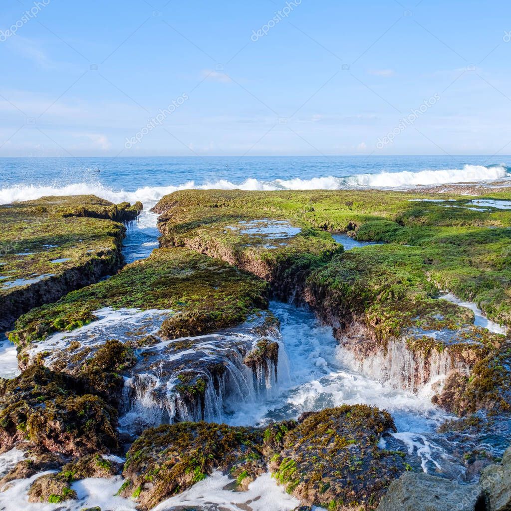 - Sawarna Beach Beautiful skies and large rocks adorn the shore.