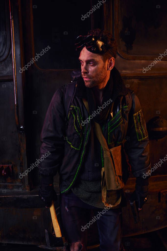 Unshaven man with military goggles holding axe and looking away in post-apocalyptic subway