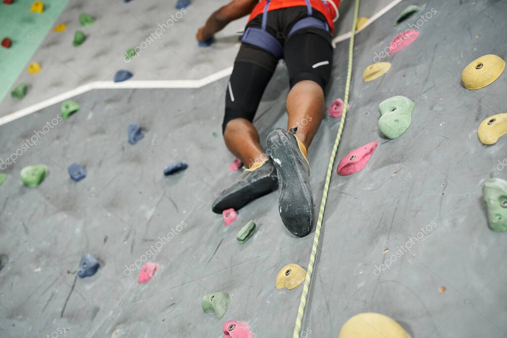 Cropped view of legs of strong african american man climbing up bouldering wall with alpine harness