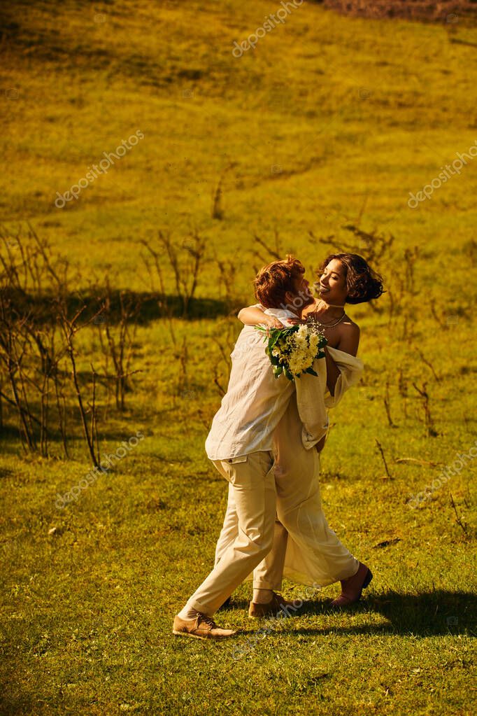 redhead groom embracing cheerful asian bride with flowers in green field, rural celebration