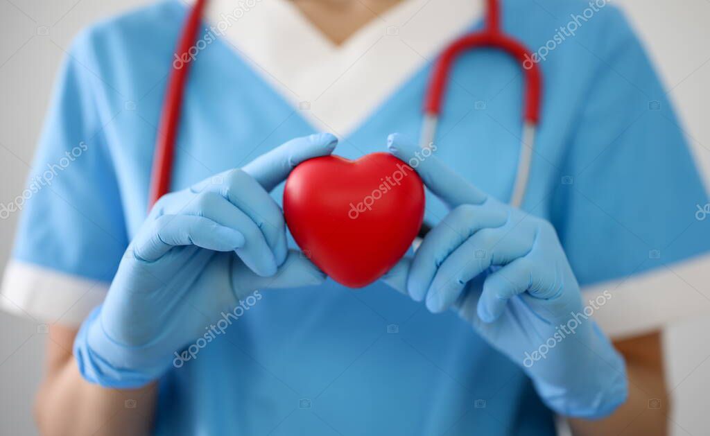 Doctor in gloves holds a red heart. Diseases of the cardiovascular system concept