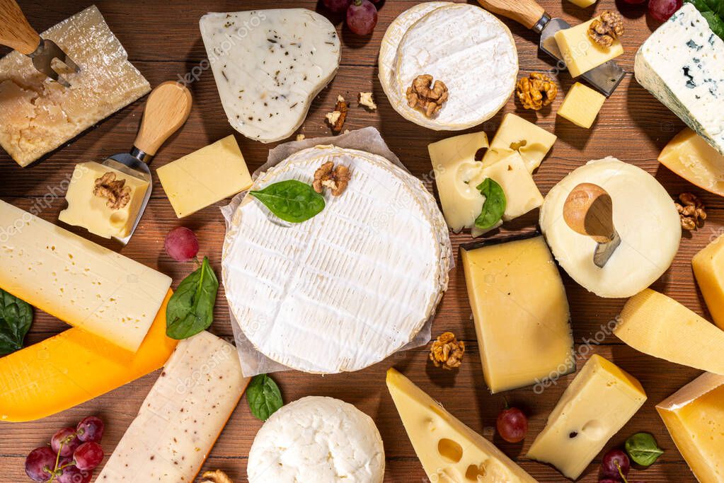 - Different sorts of cheese set. Cheese platter with various cheese, with grapes, nuts, cheese knife and spices, wooden background copy space