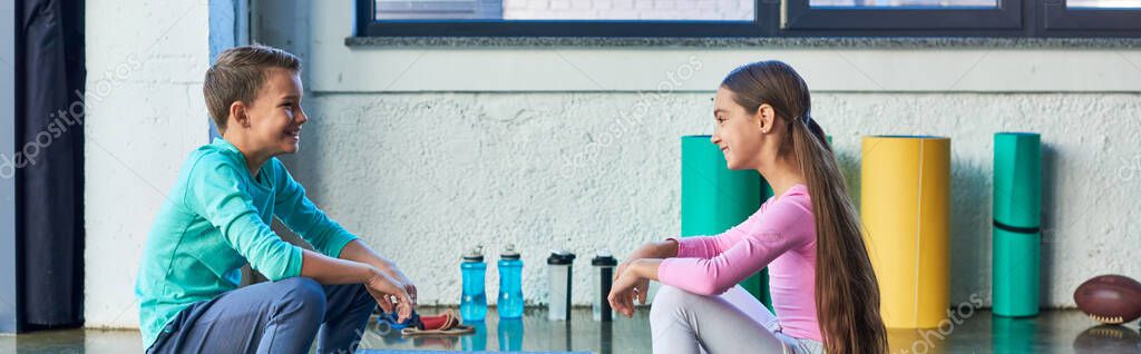 joyful boy and girl in sportswear sitting and smiling cheerfully at each other, child sport, banner