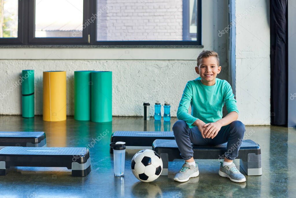 cheerful preadolescent boy on fitness stepper next to soccer ball and water bottles, child sport