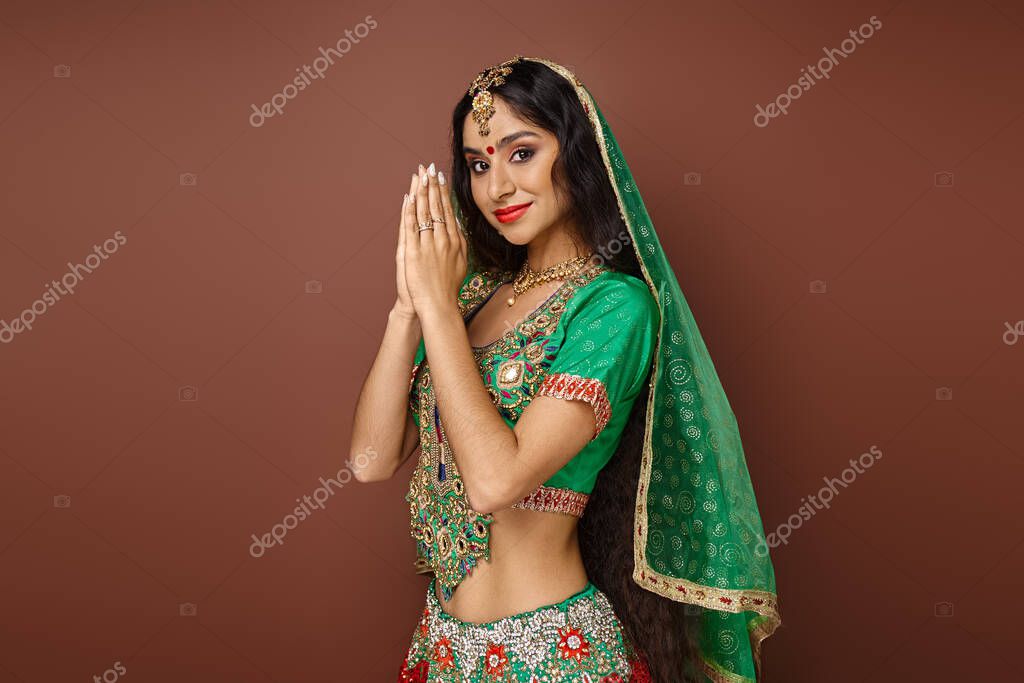 attractive young indian woman in national costume showing praying gesture and smiling at camera