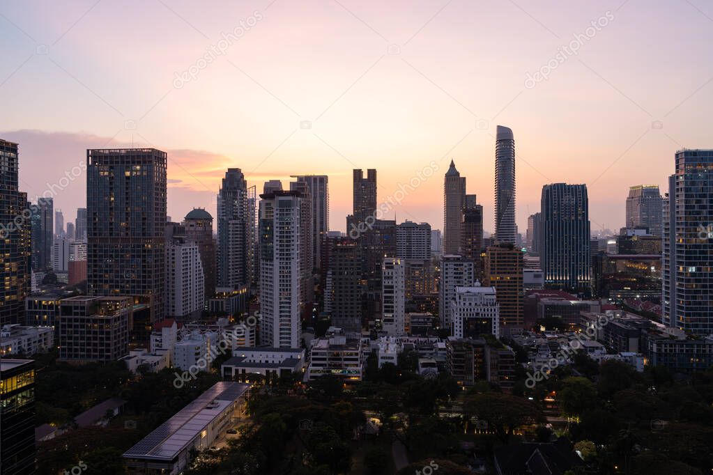 - View of Bangkok city panorama with glowing skyscrapers windows and trees in evening. Concept of tourism, business and travel in Thailand