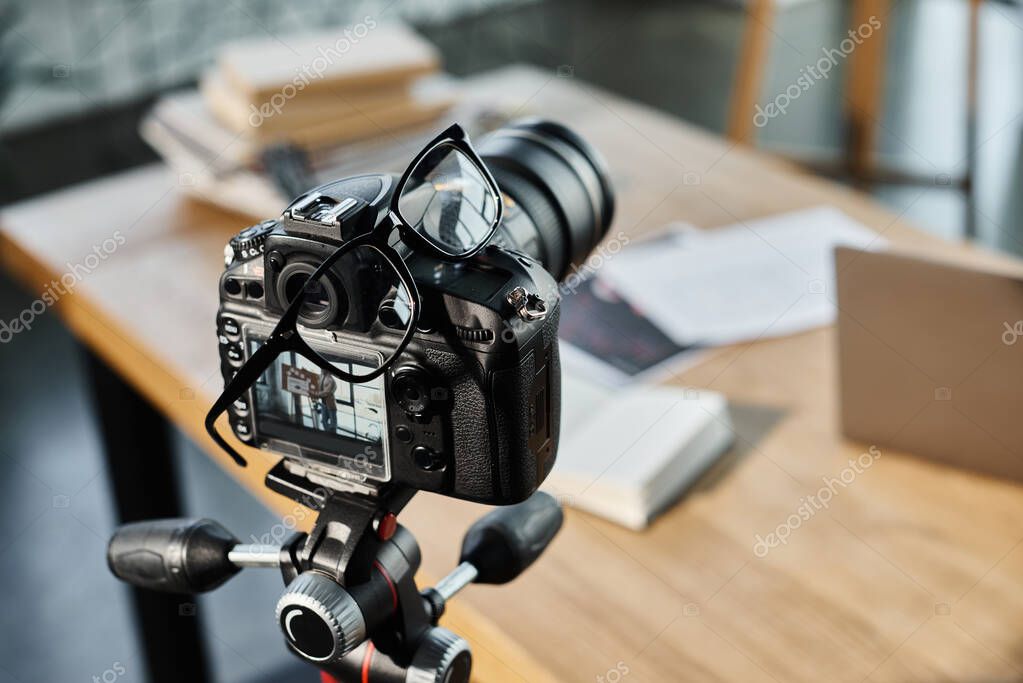 Selective focus of digital camera and eyeglasses in office on blurred background, video blog