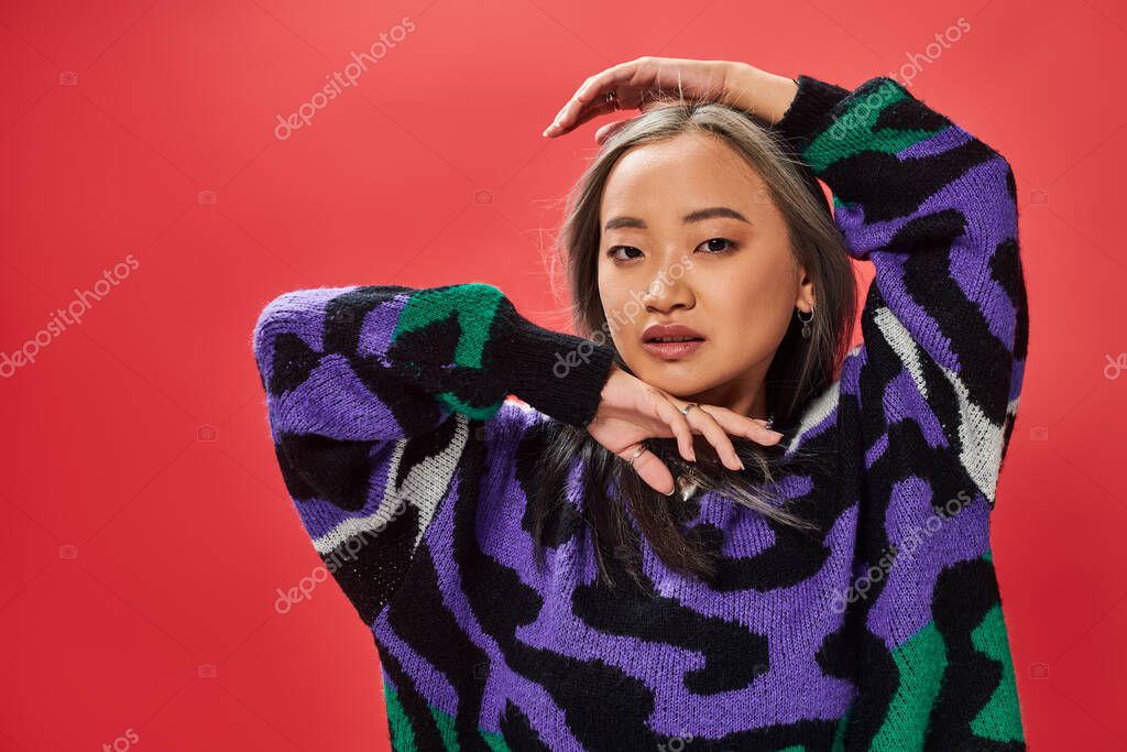 RED COLORFUL BEAUTIFUL SILVER ELEGANCE GIRL YOUNG MODEL WIND YOUTH FASHION PRETTY PURPLE NECKLACE STYLISH WOMAN LIFESTYLE TRENDY ASIAN CHARMING CHIC ATTRACTIVE SWEATER RELAXED CONTEMPORARY GESTURE KNITTED FASHIONABLE YOUTHFUL ALLURING EYE CATCHING HEART SHAPED VIBRANT COLORS LOOK AT CAMERA ANIMAL PRINT GOOD FEELING URBAN STYLE CASUAL STYLE FASHION STATEMENT HANDS NEAR FACE GEN Z VISUAL APPEAL STYLISH WEAR TRENDY ATTIRE GEN Z FASHION