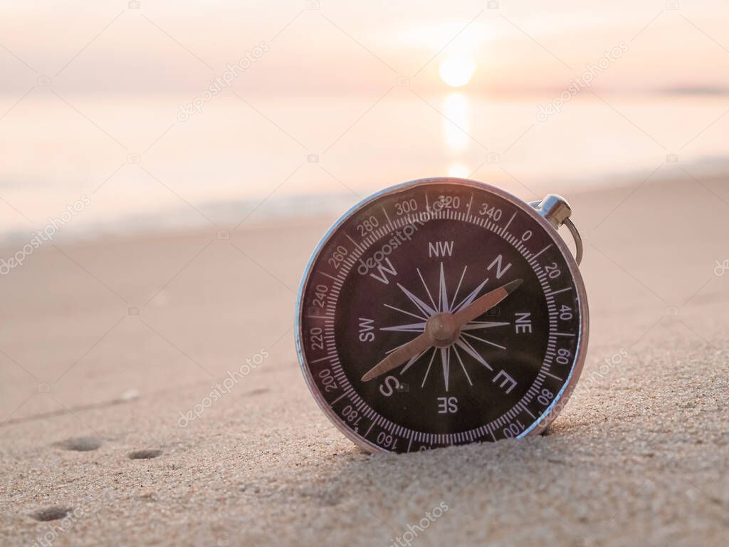 - Close up compass on the beach with sunlight