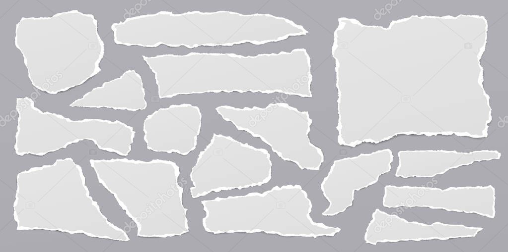 - Set of torn white note, notebook paper stripes are on grey background for text. Vector illustration.
