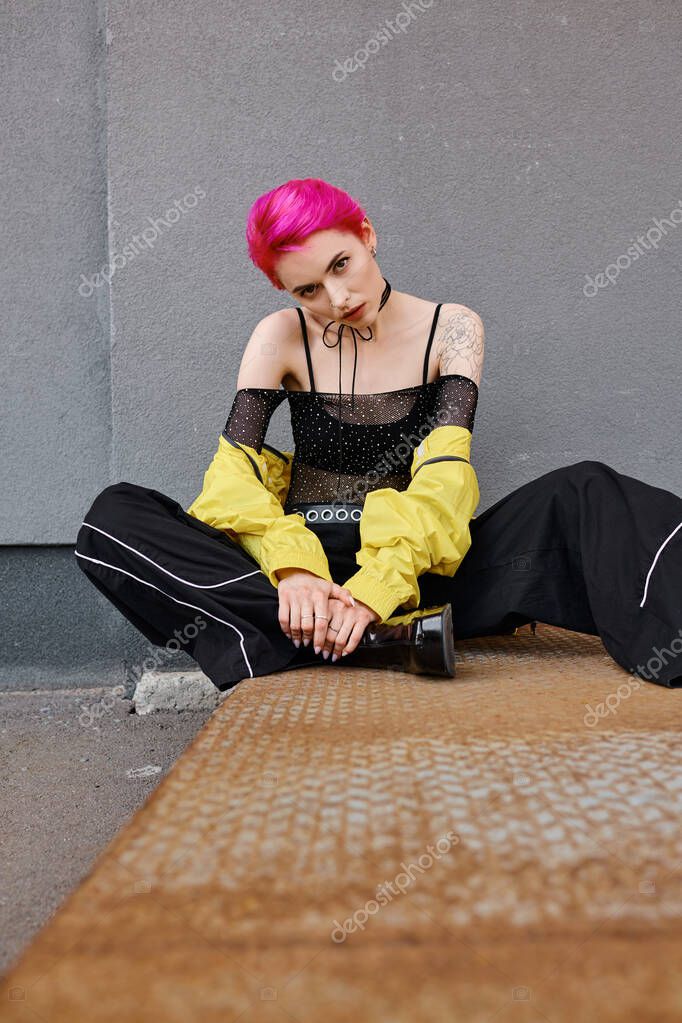 young appealing woman with short pink hair and tattoos sitting and looking at camera, fashion
