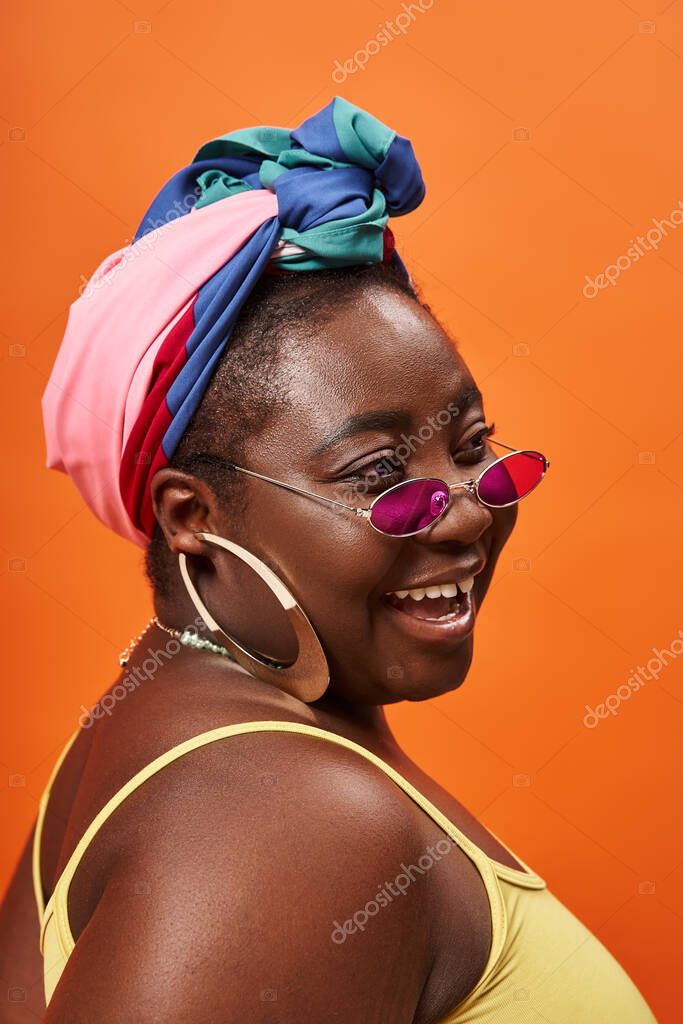 jolly plus size african american woman in headscarf and trendy sunglasses on orange backdrop