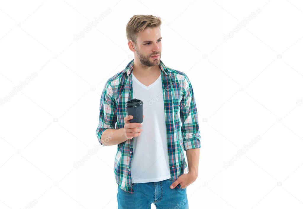 Casual caucasian man with coffee on background. caucasian man with coffee in studio. photo of caucasian man with coffee. caucasian man with coffee isolated on white.