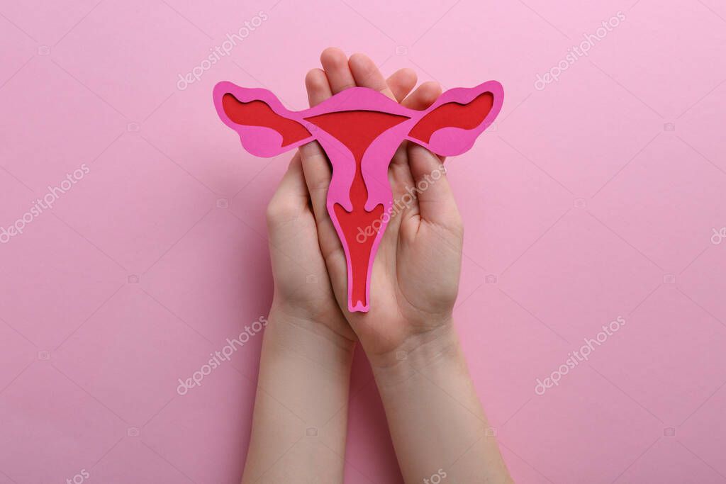 Reproductive medicine. Woman holding paper uterus on pink background, top view