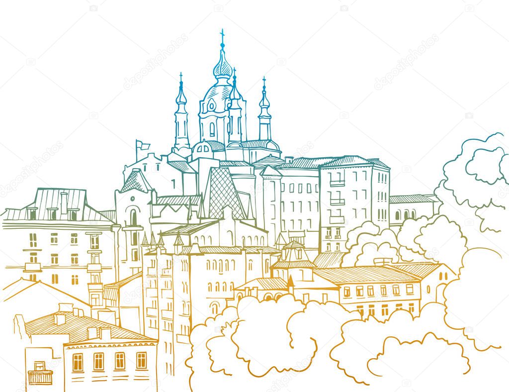 Nice view of the old Kiev. Ukraine. Trendy urban landscape. Cityscape. Hand drawn sketch. Line art. Postcards.
