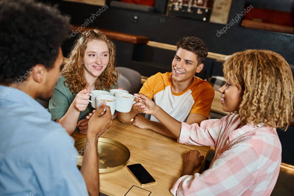 - carefree multiethnic students clinking coffee cups in lobby cafe of youth hostel, travelers
