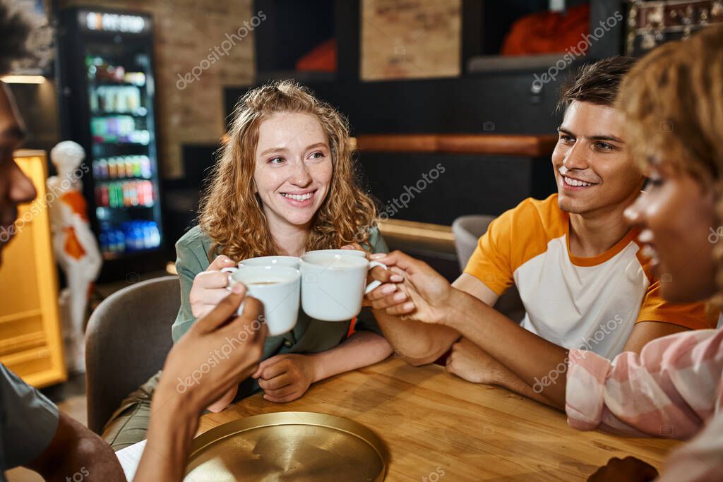 - pleased multiethnic buddies clinking coffee cups in lobby cafe of students hostel, friendship