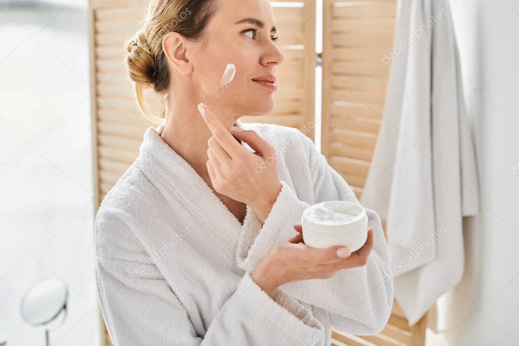 - appealing blonde woman in comfy white bathrobe applying face cream while in bathroom at home