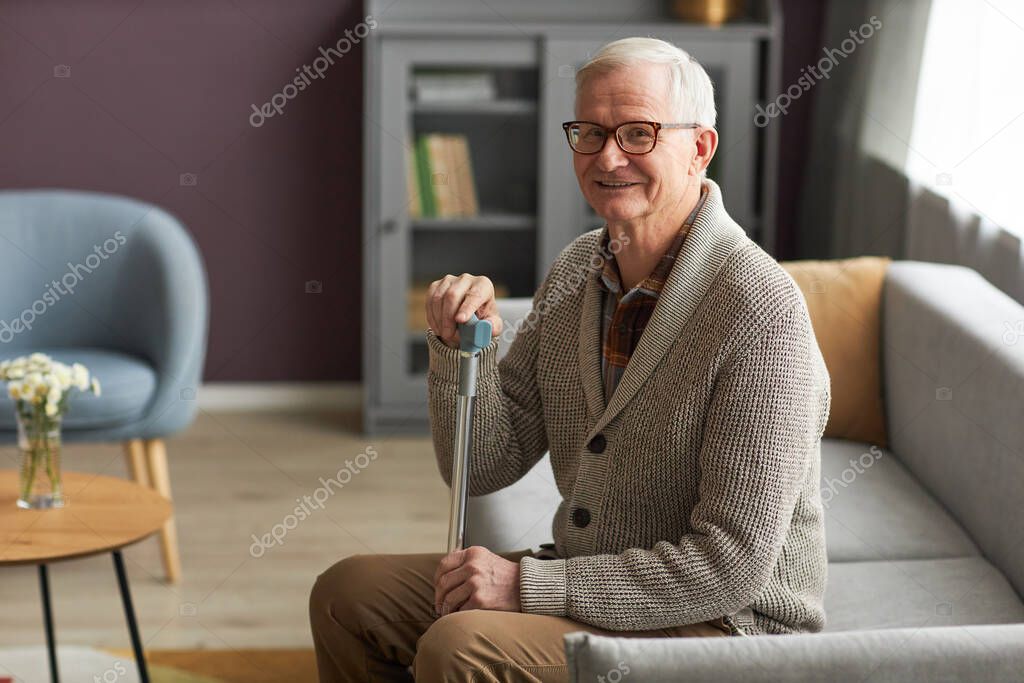 LEISURE RELAXATION PORTRAIT CAUCASIAN SMILE LIFESTYLES MAN OLD MODERN REST HOME STICK EYEGLASSES EYEWEAR POSITIVE SENIOR RETIRED RETIREMENT SOFA GRANDFATHER ARMCHAIR ELDER PENSIONER LOOKING AT CAMERA HOME INTERIOR LIVING ROOM AGING PROCESS CASUAL CLOTHING WHITE HAIR GRAY HAIR DOMESTIC LIFE GREY HAIR DOMESTIC ROOM ACTIVE SENIORS