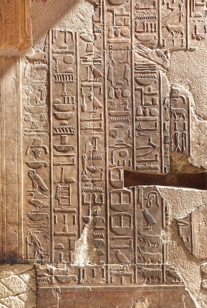 - Ancient Egyptian hieroglyphs on stone wall inside Hatshepsut Temple in Valley of the Kings, Luxor, Egypt. Stone carvings with hieroglyphs, wall of the Hatshepsut temple in Western Thebes