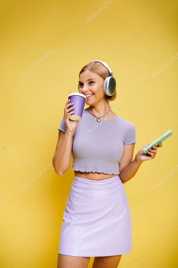 beautiful cheerful woman with headphones and cell phone enjoying her coffee on yellow backdrop