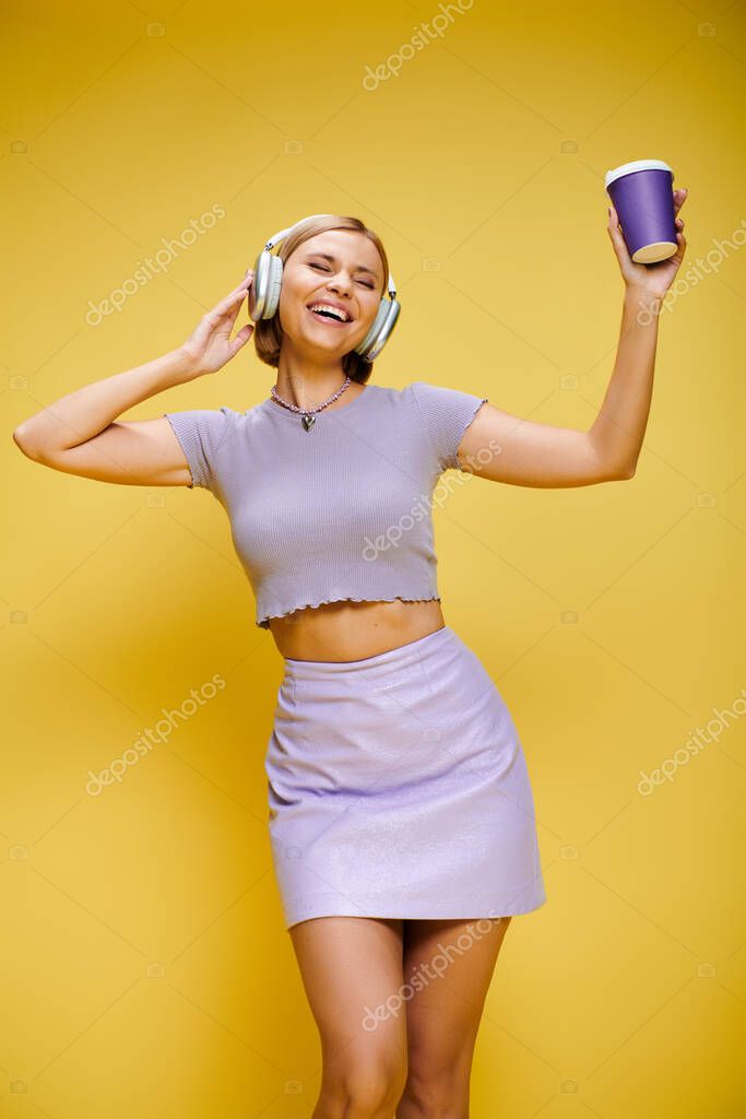 - contented trendy woman with headphones enjoying music and hot coffee while posing on yellow backdrop