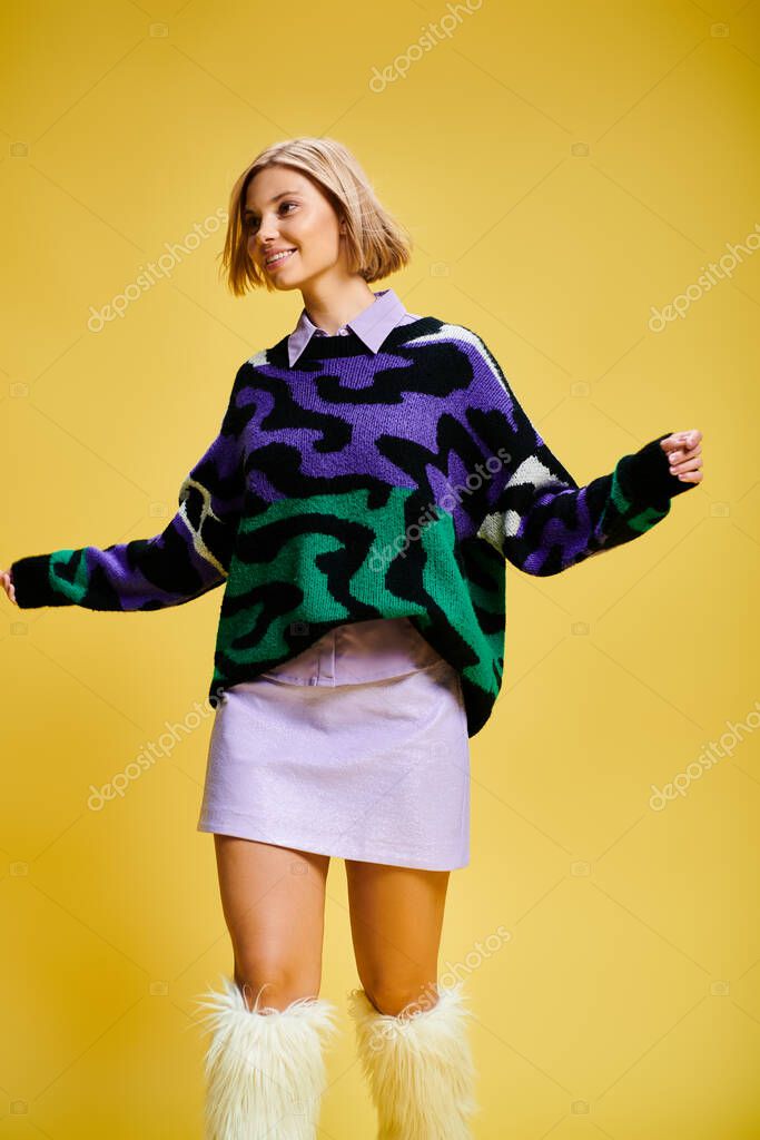 - joyous good looking woman with short hair in vibrant sweater posing actively on yellow backdrop