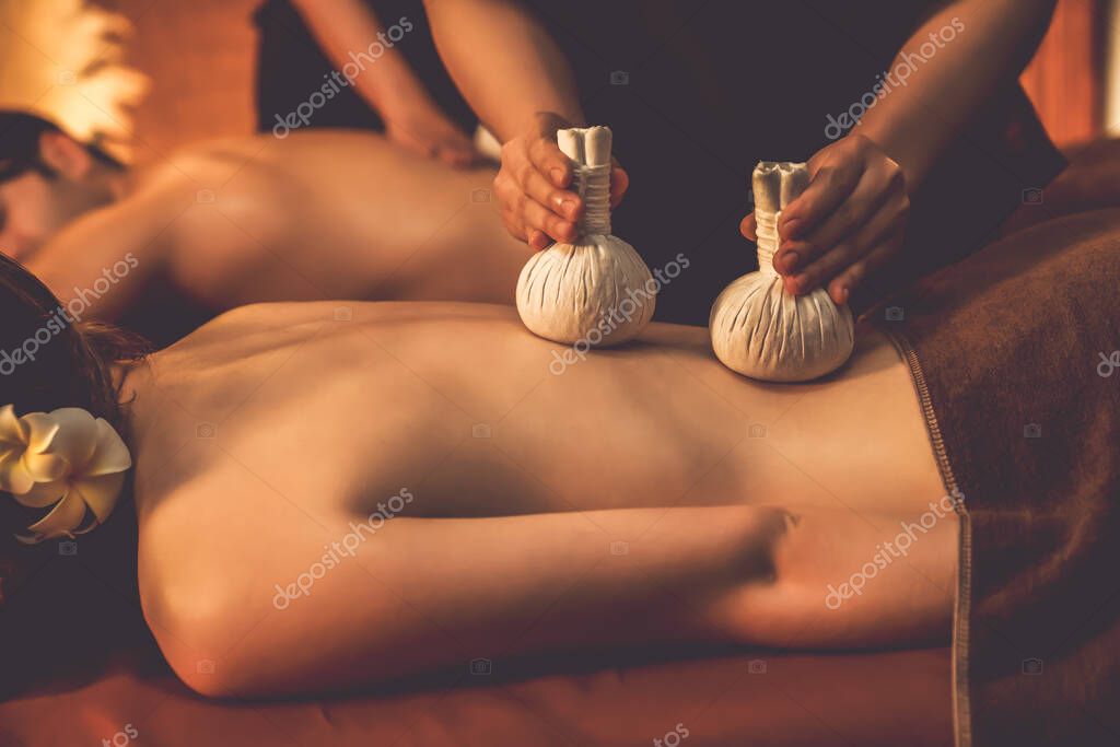 - Hot herbal ball spa massage body treatment, masseur gently compresses herb bag on couple customer body. Serenity of aromatherapy recreation in warm lighting of candles at spa salon. Quiescent