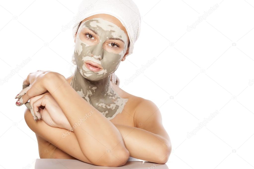 Young beautiful woman posing with a mask on her face and a towel on her head