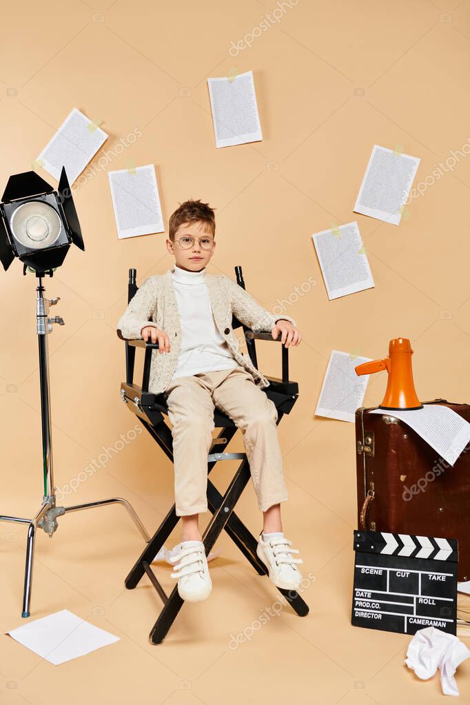 - Young boy dressed as a film director sitting in a chair, ready for action.