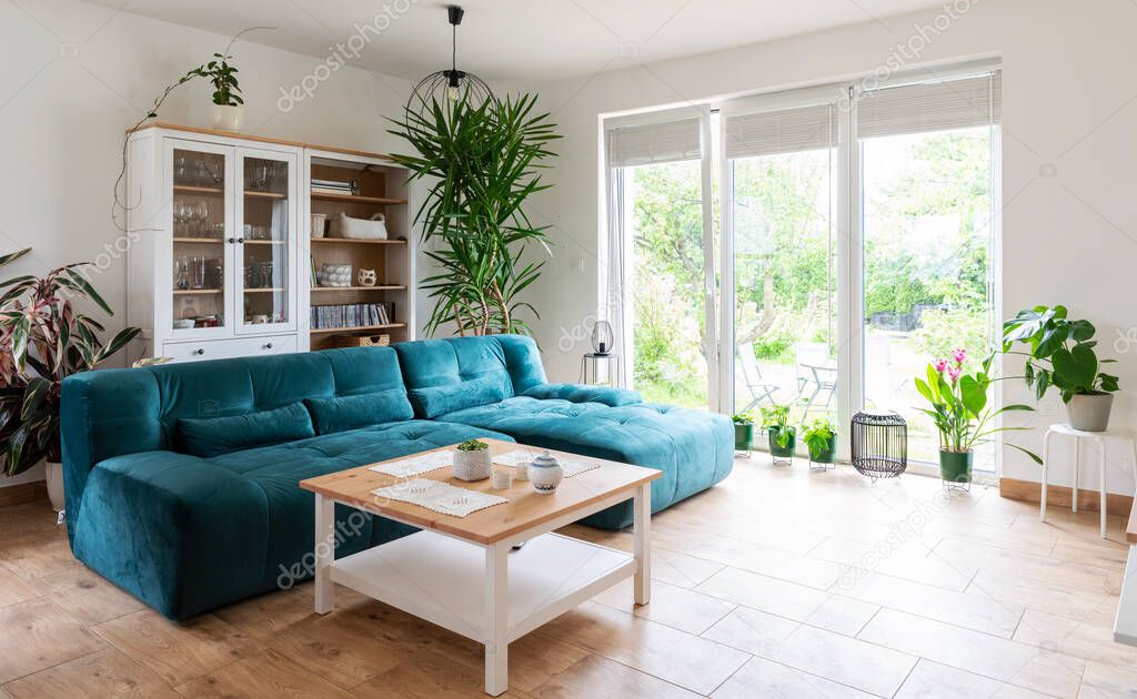 - Comfortable interior of living room with design sofa, wooden floor, big window and plants. Room in hotel with space and scandinavian decoration. Houseplant in studio apartment.