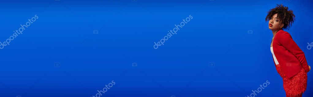 chic african american woman in red blazer with curly hair looking at camera, blue backdrop, banner