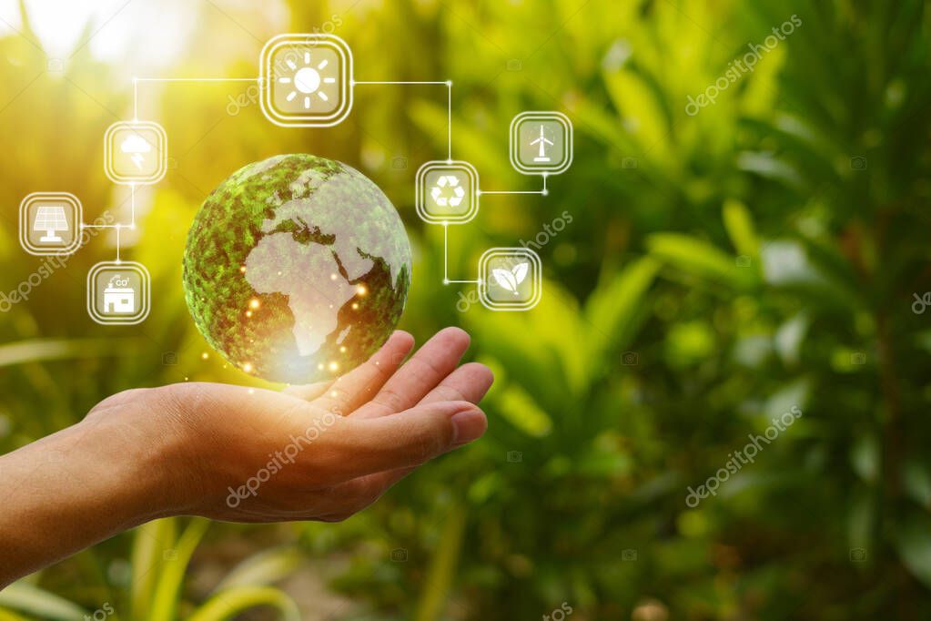 - Environment concept. Green earth planet in hands with shining light. Save and protection Earth. sustainable and corporation development, green eco friendly.