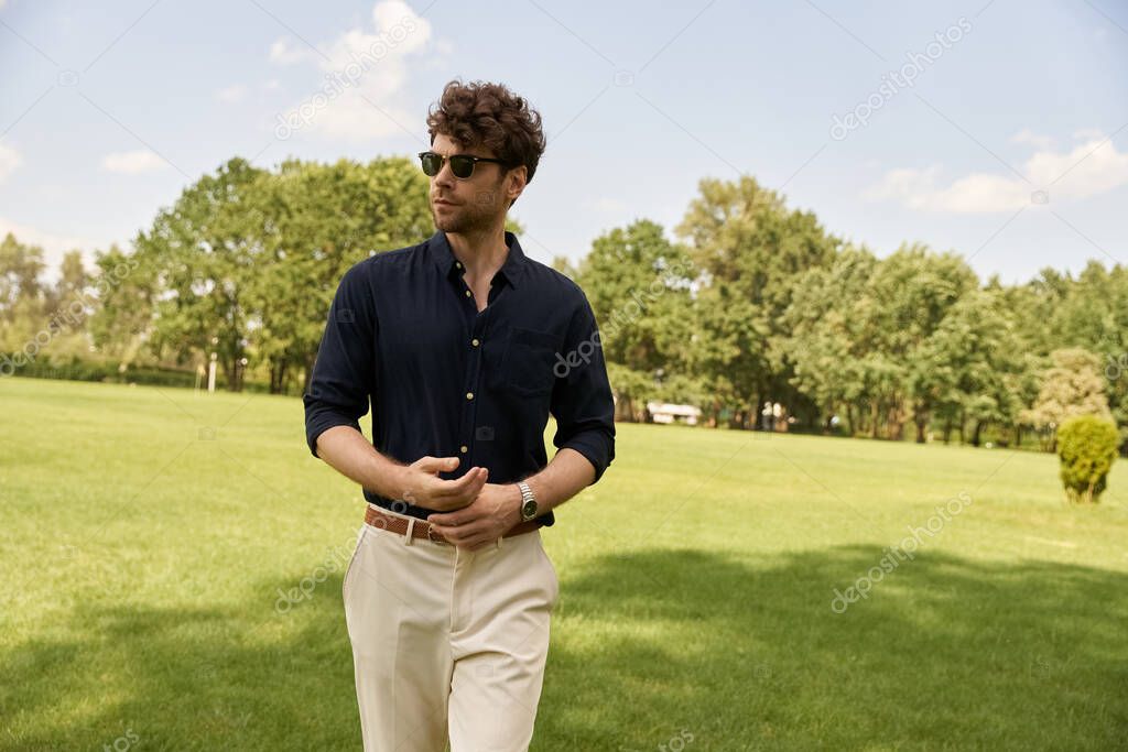 LEISURE GREEN LUXURY WEALTH ELEGANCE SUMMER CLOTHING RELAXATION MEADOW OUTDOORS FIELD NATURE CAUCASIAN RICH MAN FASHION ELEGANT STYLISH LIFESTYLE TRENDY SUNGLASSES CHIC WALK HANDSOME POSING STANDING FASHIONABLE SOPHISTICATED GRASSY STROLL GENTLEMAN CLASSY AESTHETIC AFFLUENT DAPPER TRENDSETTING UPPER CLASS GREEN FIELD SPENDING TIME HIGH CLASS TAN PANTS NAVY SHIRT OLD MONEY STYLE