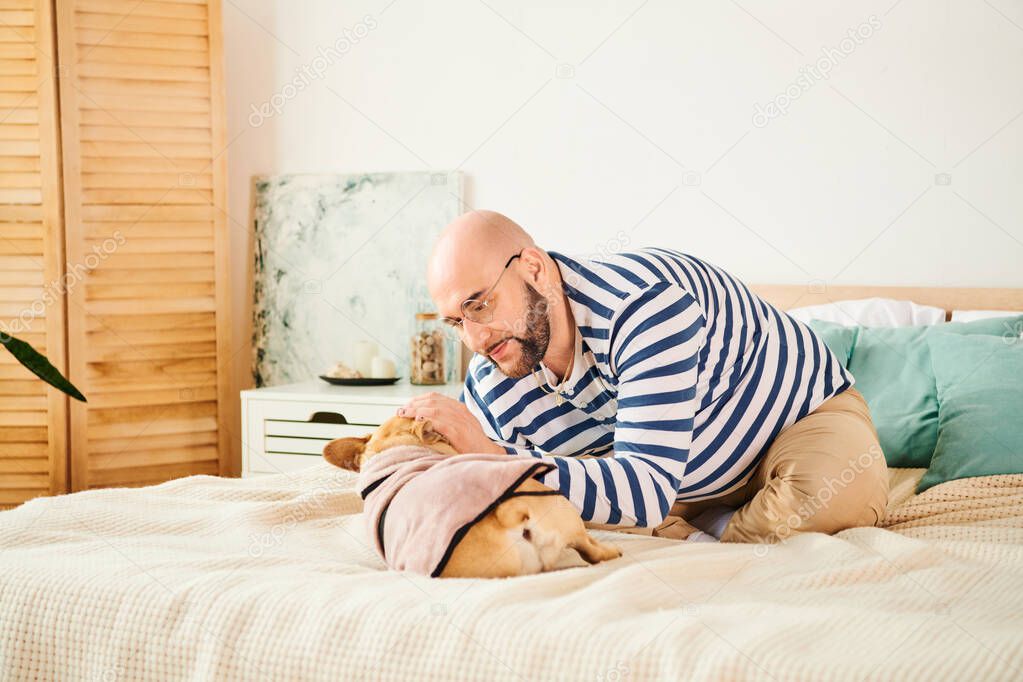 - A man with glasses relaxing on a bed next to his French bulldog.