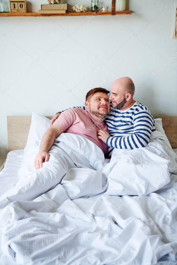 - Two men relax on a bed at their home