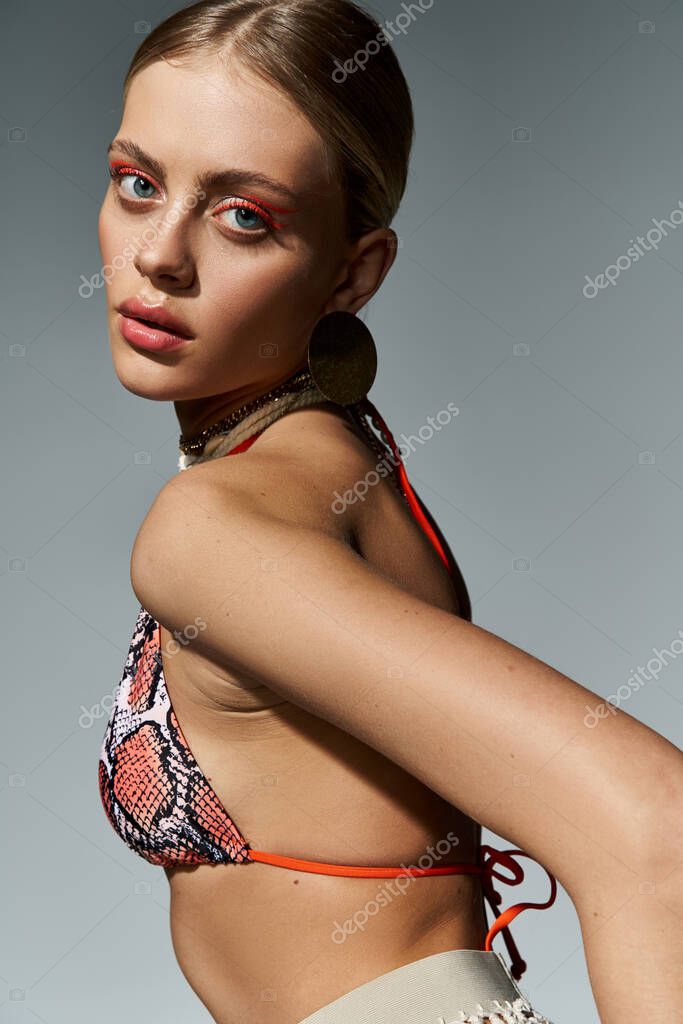 - A blonde woman in a stylish bikini strikes a pose for a magazine shoot.