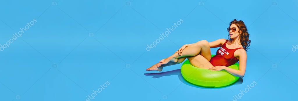 - Banner. Young woman in retro swimsuit relaxing in neon-green inflatable ring against blue background with negative space to insert text,. Concept of pop art, remote work, travelling, party, recreation