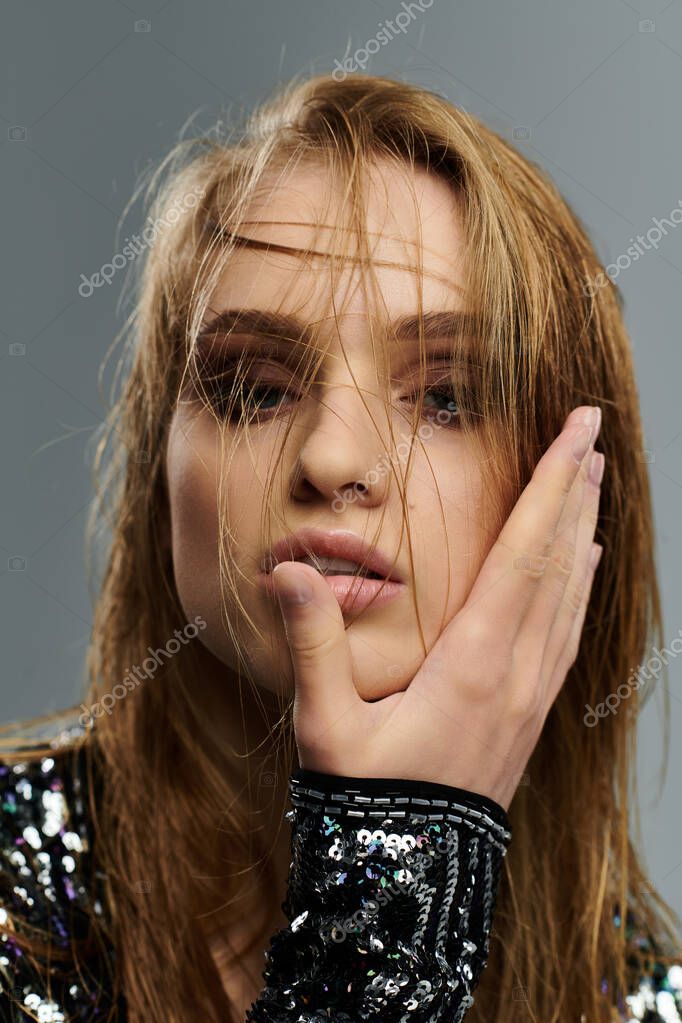 - A young woman showcases her wet hair in a mesmerizing close-up shot.